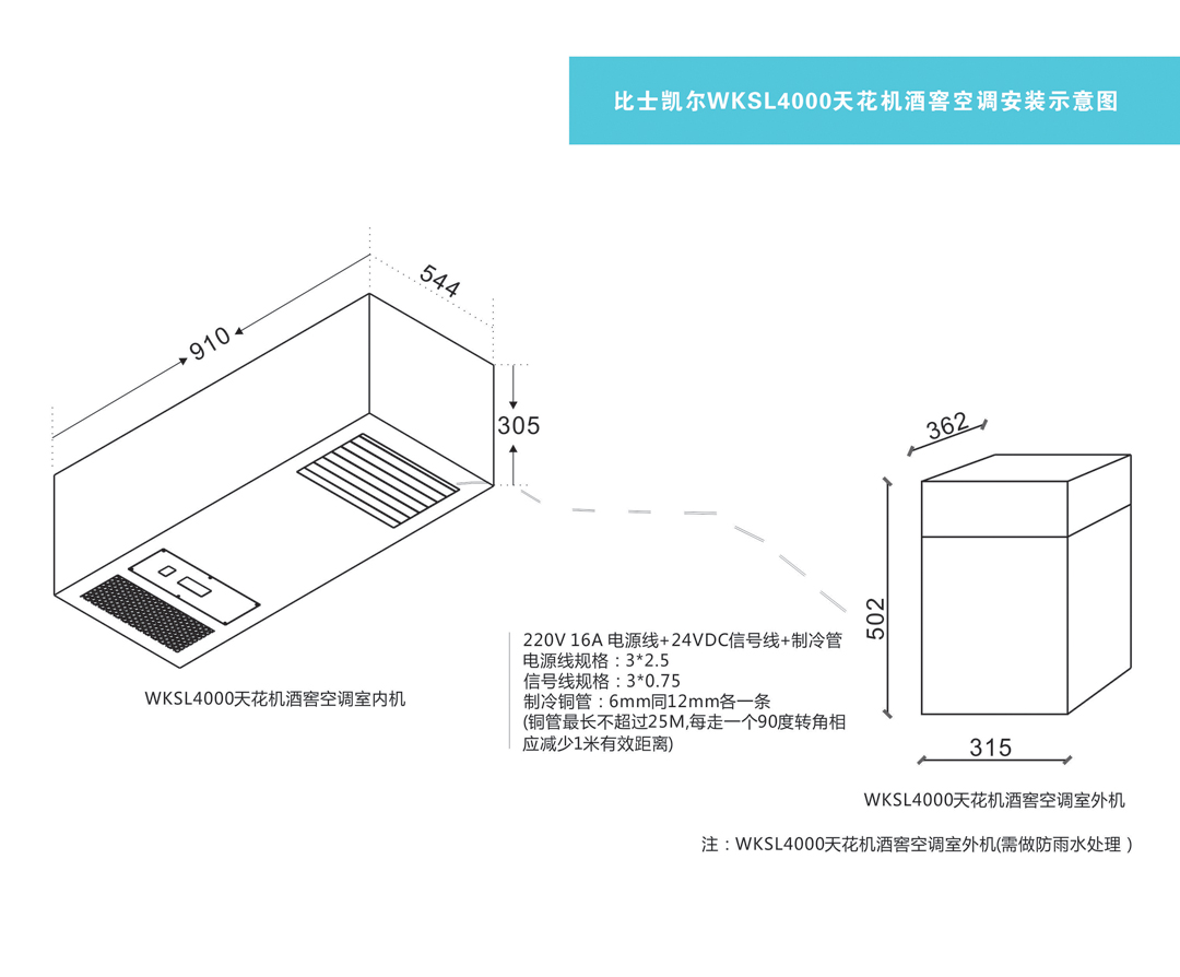 比士(shì)凱爾吊頂式酒窖恒溫恒濕空調,室內機吊頂於天花中,不占用(yòng)酒架儲酒空間,室(shì)外機(jī)采用(yòng)不超過15M的銅管連接,可滿足(zú)1-60個立方的酒(jiǔ)窖空間進行恒溫恒濕,其它WKSL4000-C適用於1-30立方(fāng)米酒窖空間使用,WKSL8000-C適用於30-60立方米(mǐ)酒窖(jiào)空間使用