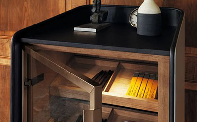 雪茄房的門主要考慮兩點: 1.整體的保溫隔(gé)熱,通常采用雙層中空玻璃或實(shí)木門中(zhōng)間嵌(qiàn)入保(bǎo)溫層 2.門的材料要有利於雪茄的(de)醇化,所以我們采用西班牙雪鬆木進行製作(zuò)