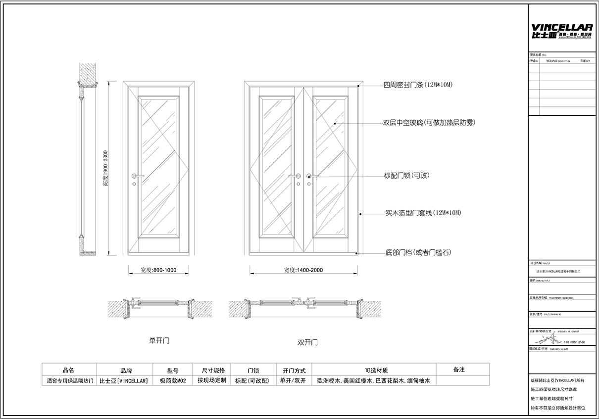 極簡係列透明玻璃酒窖門設計與做法 極簡係列透明玻璃酒窖專用保溫隔熱(rè)門,采用(yòng)按現場定製模式,門可分為(wéi)單開門(單(dān)開門尺寸:寬度為:800mm-1000mm,高(gāo)度為:1900mm-2300mm)與雙開門(雙開(kāi)門尺寸(cùn):寬度為:1400mm-2000mm,高度為:1900mm-2300mm),門頁以雙層中空玻璃或者三層中空玻璃上貼隔熱膜防玻(bō)璃上(shàng)掛霧(wù)珠,分別(bié)以:歐洲櫸木,美國紅(hóng)橡木,巴西(xī)花梨木,緬甸柚木四(sì)種材質做為外框及門框做法