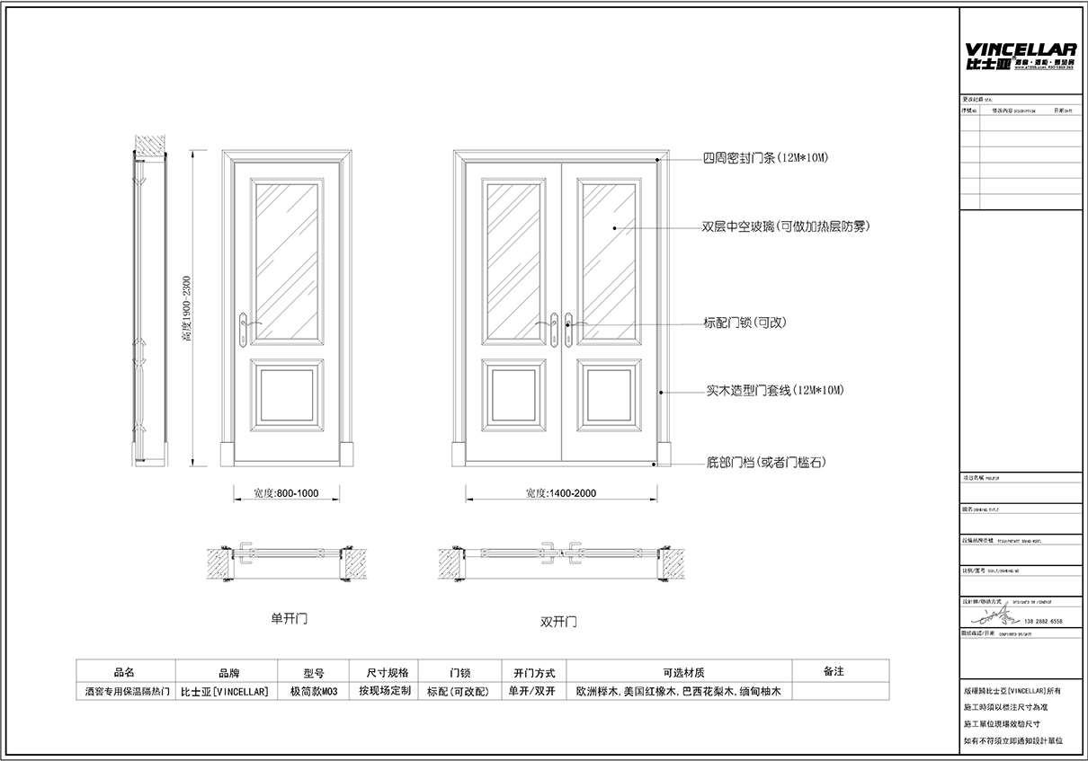 極簡係列玻木結合酒窖專用保溫隔熱門,采(cǎi)用按現場定製模式,門可分為單(dān)開門(單開門尺寸寬度為(wéi)800mm-1000mm,高度為1900mm-2300mm)與雙開門(雙開門尺寸寬度為1400mm-2000mm,高度為1900mm-2300mm),門頁以雙(shuāng)層中空玻璃或者三層中空玻璃上貼隔(gé)熱膜防玻璃上掛霧珠,下部分為全(quán)實木內嵌保溫層分別以歐洲櫸木,美國紅橡(xiàng)木,巴西花(huā)梨木,緬甸柚木四種材質做為外框及門框做法