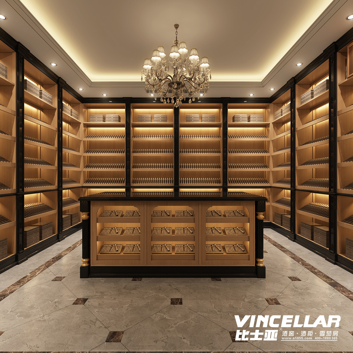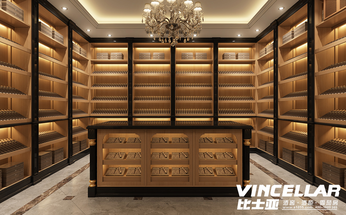 整(zhěng)體設計以簡歐(ōu)風格,層架采(cǎi)用西班牙雪鬆木,製冷係統為比士凱(kǎi)爾[BREEKREE]雪茄房專用恒溫恒(héng)濕機(jī)